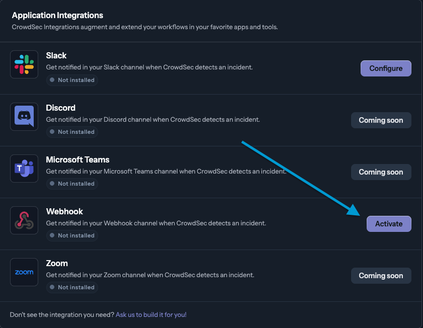 - In the CrowdSec Console, navigate to Settings > Integrations and then select Activate in the Webhook row.