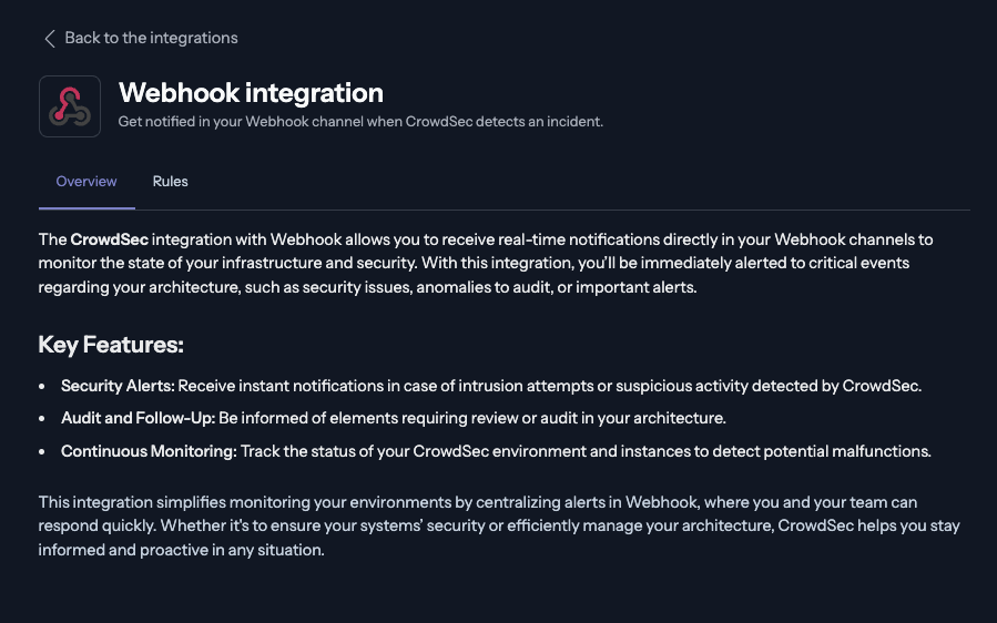 - You should be redirected to the Webhook integration page. You can now create a notification rule by navigating to the Rules tab.